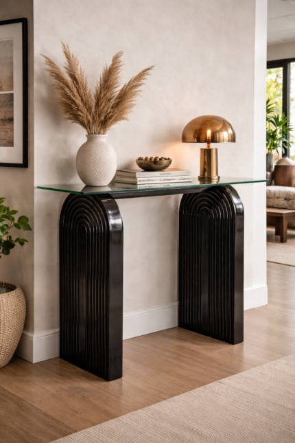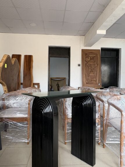 Derived from an ancient fallen mango tree root , left to years to be seasoned console has a black glass