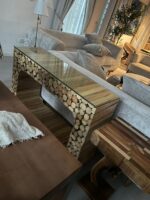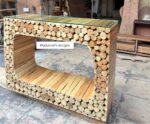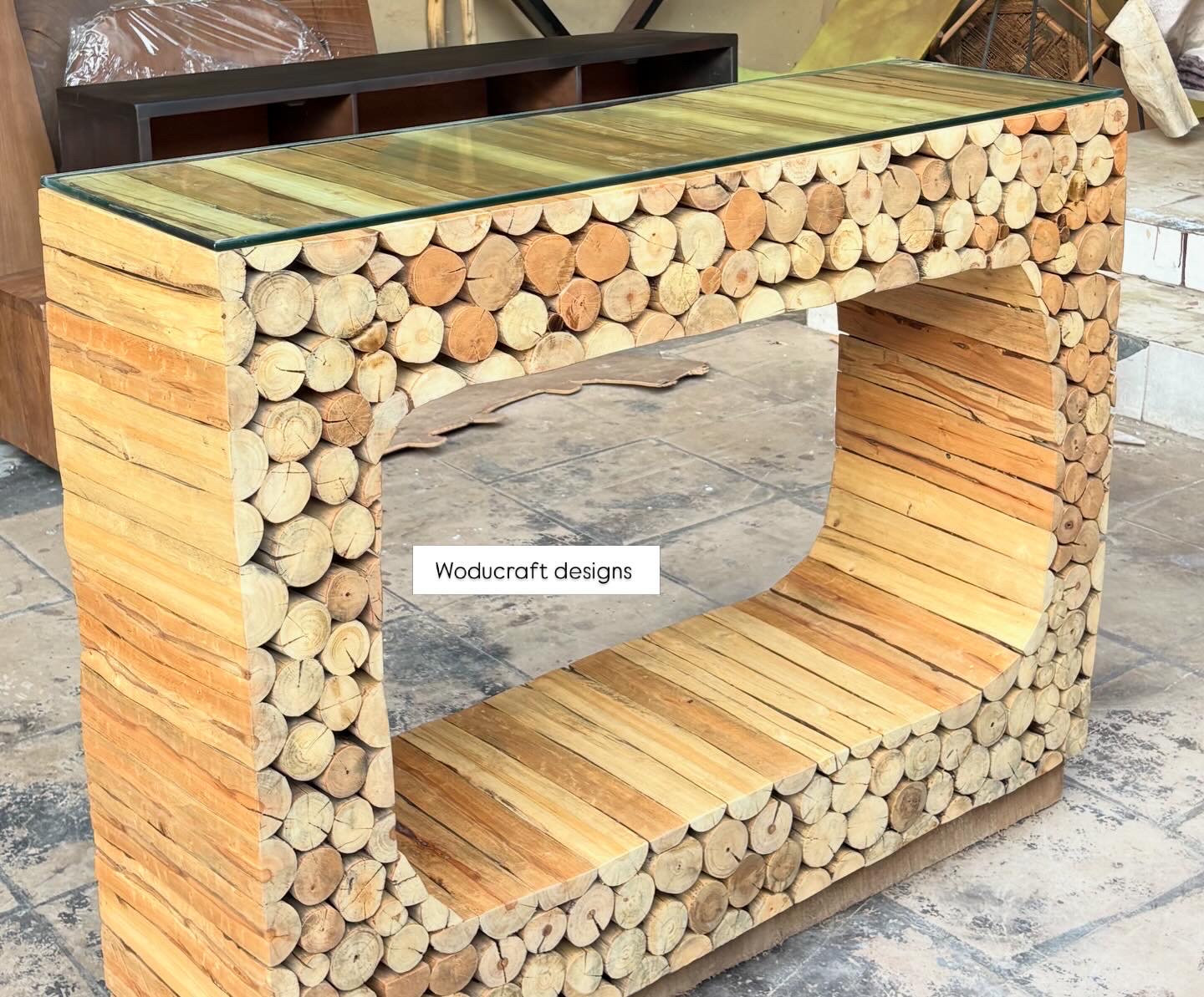 Made from tree branches and paired with a glass top.